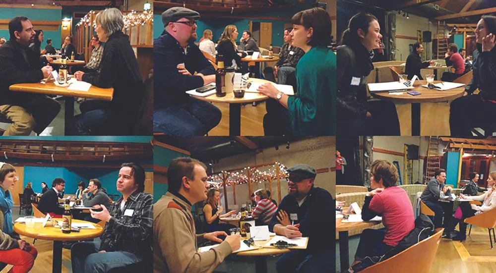 Much like an actual speed dating event, where one goes to find the person they would love to date, our Speed Dating is set up to help artists find others with whom they'd love to work. We also hope to simply get a variety of theater artist chatting about their work with people they might not normally have the opportunity to talk with. 12 directors and 12 playwrights meet up. Each has one minute to talk about their work (with a couple of extra minutes to shoot the breeze). At the end of the night each had contact information for everyone in the room and hopefully some sparks for new working relationships!
